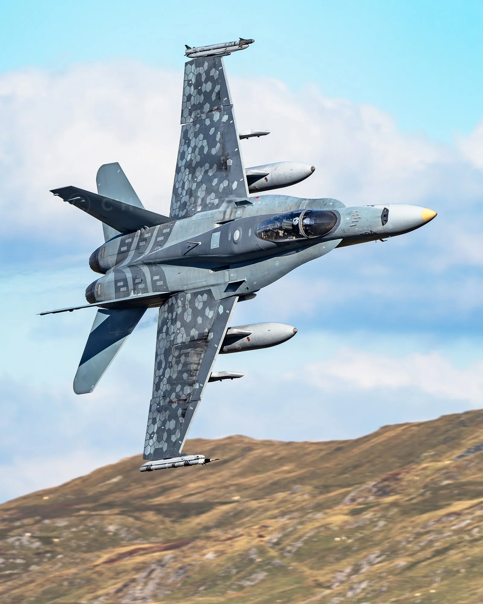 During September 2025, Exercise Cobra Warrior 25-2 took place throughout the United Kingdom, which included multiple daily flying from UK and International participants. I joined the Royal Canadian Air Force’s frontline fast jet squadron’s during a mission over the North Sea. 4x CF-18 Hornet’s from both 425 and 433 Squadron’s launched rom RAF Waddington to work with USAF F-15’s and later meet a 435 Squadron Lockheed CC-130H(T) aerial refueling tanker where they took on extra fuel, at 16,000ft. The four Hornet’s calling ‘SCAR’ Flight’ later continued their mission to the low level area’s of the United Kingdom, including LFA7 ‘The Mach Loop’ and LFA17.